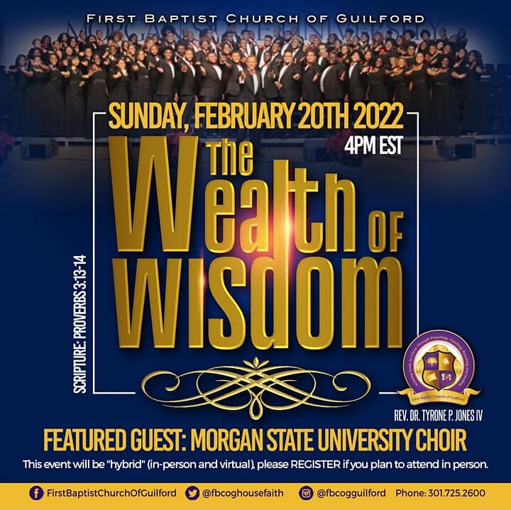 The Student Empowerment Ministry of First Baptist Church of Guilford is hosting the 4th annual HBCU Benefit Concert to help raise funds for our scholarship fund. This year’s special guest will be the Morgan State University Choir. All donations can be submitted using one of the 3 methods detailed in the image below. Online donations can be submitted here. Please use the memo “FBCOG Scholars”