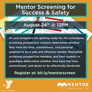 As your programs are getting ready for the schoolyear, screening prospective mentors determines whether they have the time, commitment, and personal qualities to be a safe and effective mentor. Then the mentors can screen prospective mentees, and their parents or guardians, about whether they have the time, commitment, and desire to be effectively mentored. Join MENTOR MD|DC about this vital standard of the Elements of Effective Practice for Mentoring!