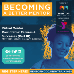 Mentors and program staff can join us for a roundtable discussion on our real life experiences of mentoring in Maryland and DC. Get advice from your fellow mentors in the field and learn from those who have experienced it all before! Join us to share your story and learn from each other to be the best mentors we can be.